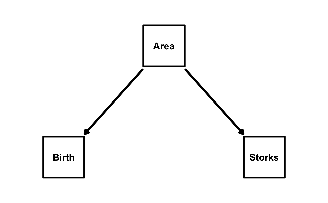 # Area 2.331e-02 8.467e-03 2.753 0.0148 *Indeed, both Births and Storks correlate significantly with Area (p < 0.0001 and p = 0.015 respectively). Matthews (2000) argued that the observed correlation between Storks and Births is actually due to the confounding effect of Area: larger countries have more storks and more births, leading to a spurious correlation between Storks and Births. Indeed, when controlling statistically for Area in a multiple regression, the effect of Storks on Births becomes non-significant: