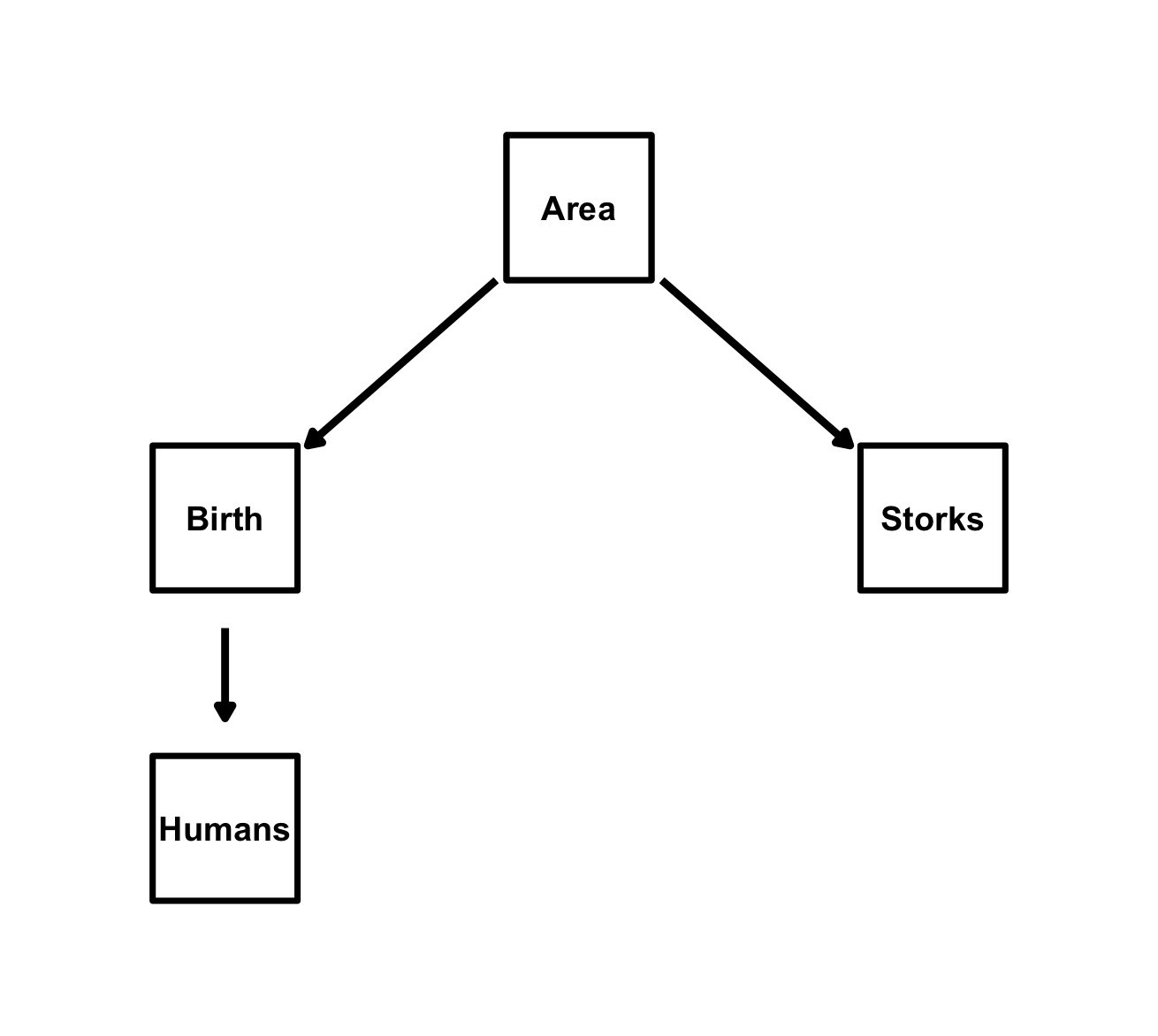 F-statistic: 9.38 on 1 and 15 DF, p-value: 0.007898The positive relationship between stork pairs and births is confirmed (p = 0.008, as already reported by Matthews, 2000), but does this mean that storks deliver babies? Or could it be that both are influenced by a third variable, such as Country Area? Let’s check if Area correlates with Births and Storks: