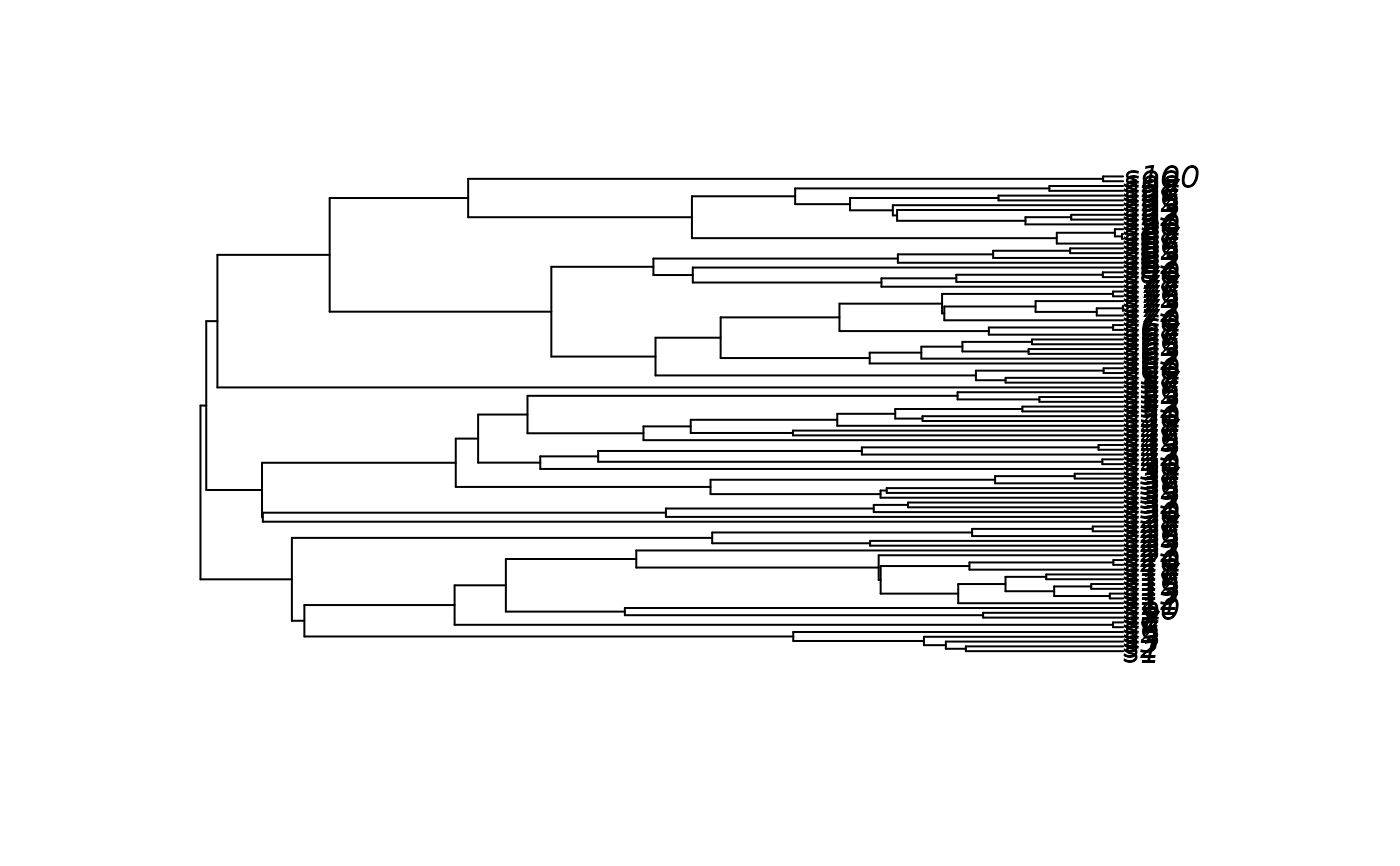 A phylo object (from the ape package) with 100 tips and 99 internal nodes. The tree has been scaled so that the root age is 1.0.